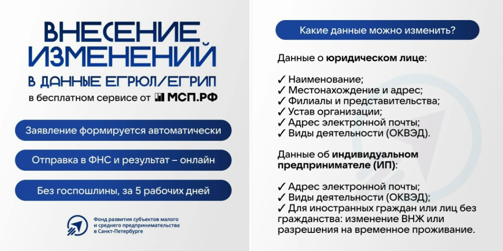 Ключевые подробности — на сайте МСП.РФ в разделе: https://мсп.рф/services/vnesenie-izmenenij-egrul/promo/?utm_source=vk_promo&utm_medium=smm&utm_campaign=01_07_2024_msp_rf